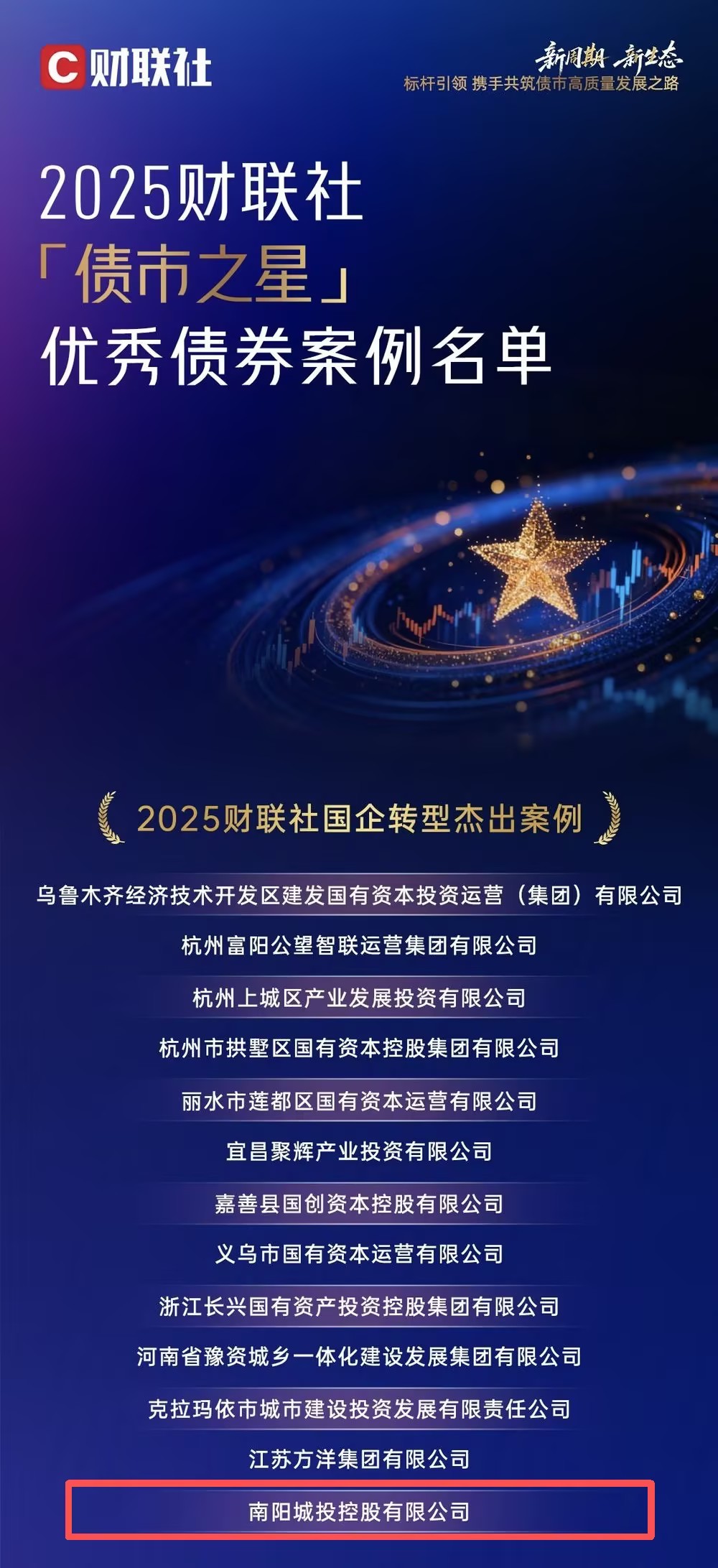 近日,資本市場傳來捷報(bào)!在2025財(cái)聯(lián)社“債市之星”優(yōu)秀債券案例評選中,南陽投資集團(tuán)旗下核心子公司—南陽城投控股有限公司(以下簡稱“城投控股公司”)憑借其市場化轉(zhuǎn)型與融資創(chuàng)新實(shí)踐,從全國百余家金融機(jī)構(gòu)、近200份案例中脫穎而出,榮獲“國企轉(zhuǎn)型杰出案例”獎(jiǎng),成為河南省在此次評選中唯一獲獎(jiǎng)的市級(jí)主體。